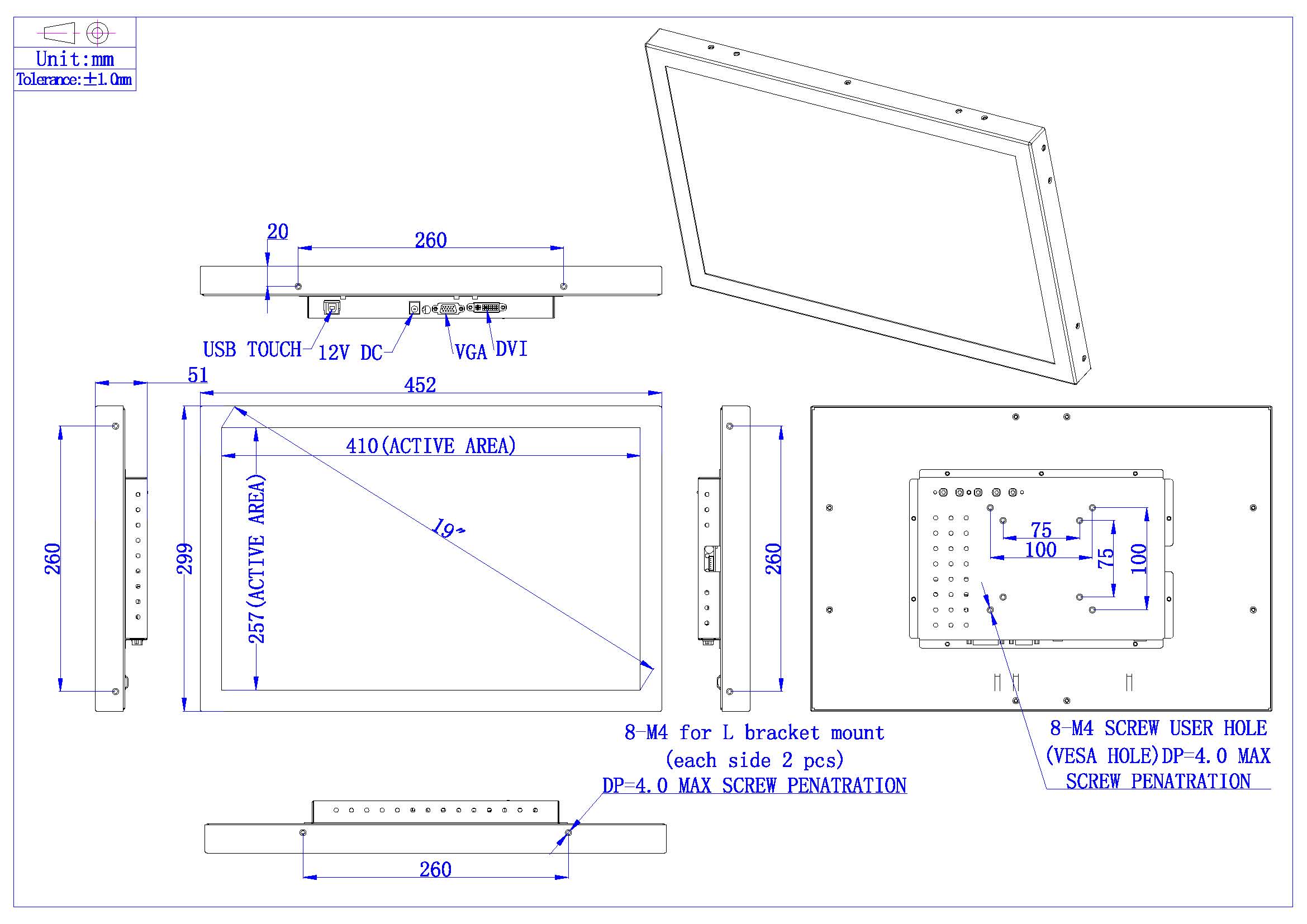 Touch Monitor Dimensions | Width: 452mm Height: 299mm Depth: 51mm | |||
